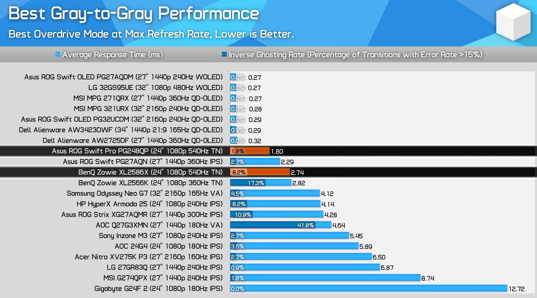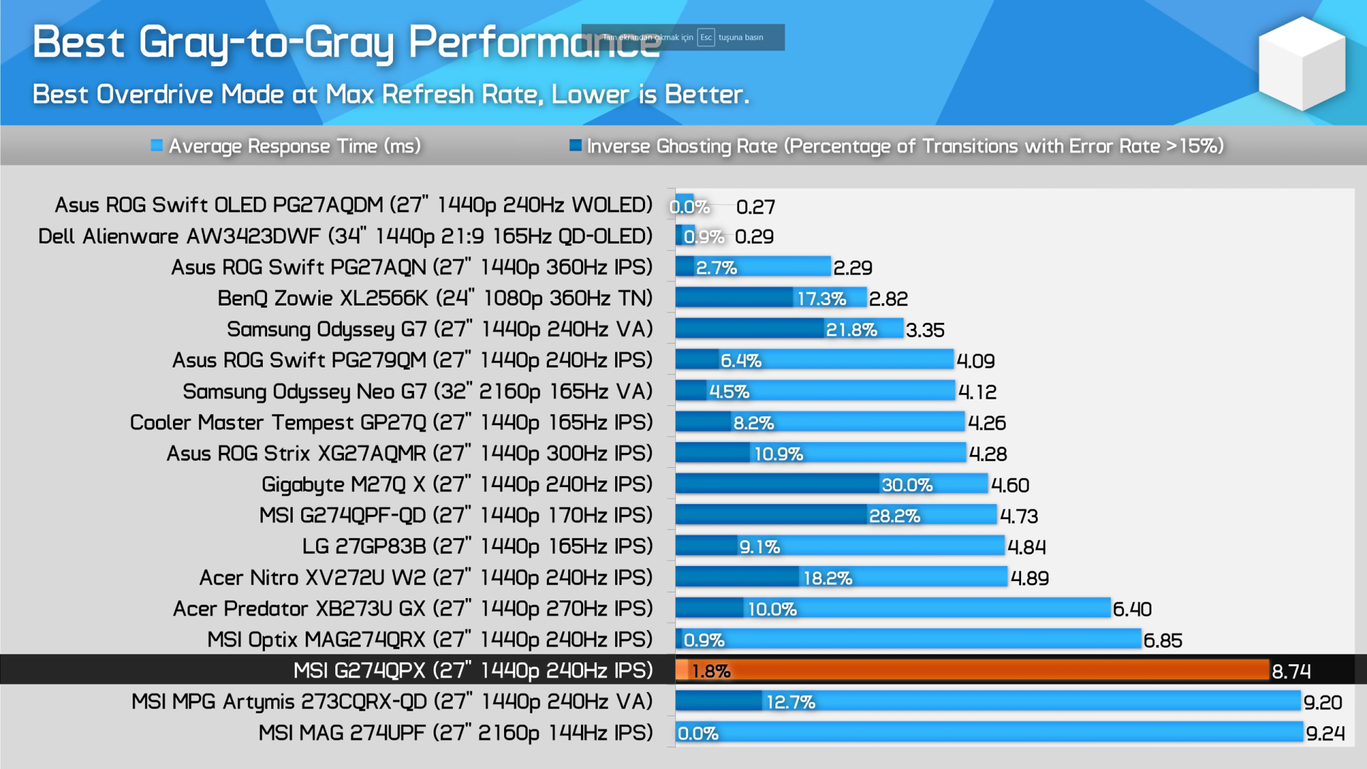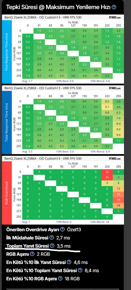 Ortalama 1ms tepki süresine sahip LCD monitör yok. 540Hz TN panel bile 2-3ms veriyor. 1ms ve altı sadece OLED tarafında var. IPS paneller ortalama 6.9ms civarı tepki süresine sahiptir. 1ms yazan bile 9ms çıkıyorsa 5ms yazanı siz hesap edin.