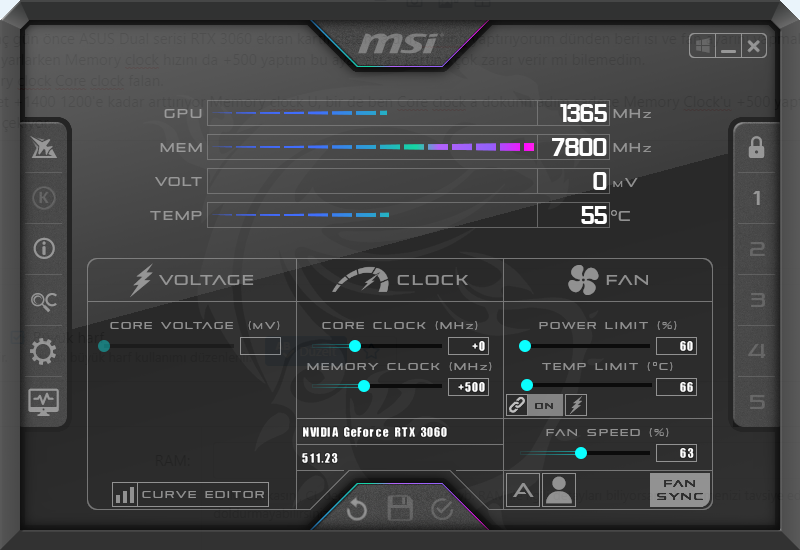 Arkadaşlar selam birkaç gün önce ASUS Dual serisi RTX 3060 ekran kartlı sistem aldım mining yaptırıyorum dünden beri ısı ve fan ayarını yapmak için MSI Afterburner indirdim orada fanı vs ayarlarken Memory clock hızını da +500 yaptım bu ayar ekran kartına çok zarar verir mi bilemedim.