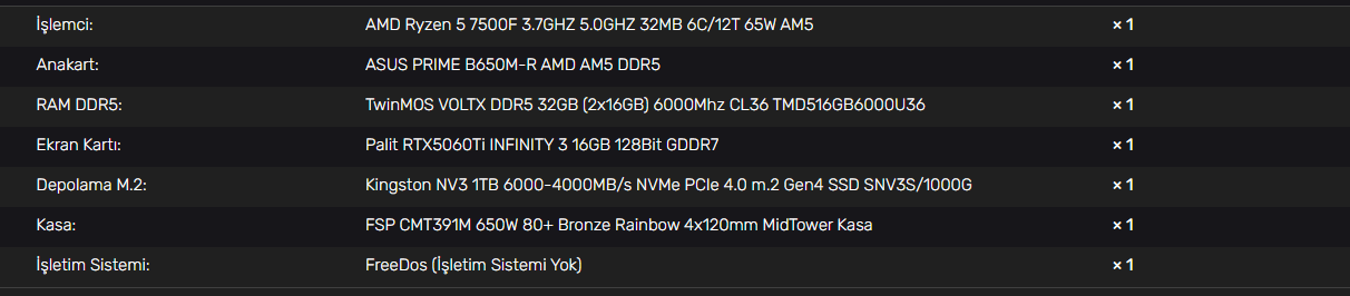 Hocam sipariş verdim 32 GB RAM ekledim ASUS B650 anakart yaptım Kingston 1B SSD kasayı da FSP CMT391M yaptım 650W yeter umarım 40k oldu sistem bu şekilde attığınız soğutucuyuda aldım 2K monitör ile kullanacağım sistemi oynadığınız oyunlarda kaç FPS alıyorsunuz ortalama ve kargo kaç günde elinize ulaştı