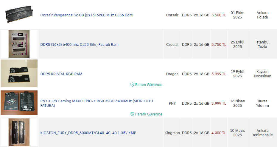 Başlangıçta RAM'i sıfır almayı düşünüyordum, ancak bütçeyi aşmamak için 16 GB üstüne çıkamadık. Günümüzde 1440P oyun için ideal bir değer değil, fakat başlangıç için yeterli. Net bir model önermedim; popüler sitelerde 6.000 MHz, CL30–36 aralığında uygun bir DDR5 model tercih edilebilir.