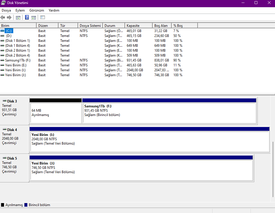 Disk Yöneticisindeki fotoğrafı referans aldığımda 3 TB hard diskinizin takılı olmadığını görüyorum. Tam oturttuğunuzdan emin misiniz?Bir tane 3 TB hard diskim var ama bilgisayar bunu 2 disk gibi görüyor. Dinamik disk olarak birleştirmeye çalışıyorum bu işlem nesne tarafından desteklenmiyor hatası alıyorum.