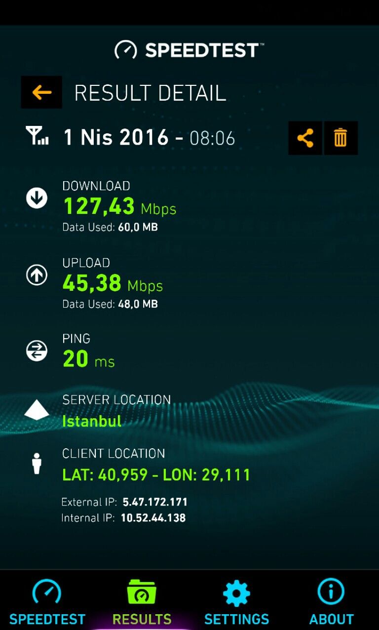 Kotayı sömüreceği için direk 3G'de kullanıyorum. Ama aldığım hız beni gayet memnun etti. 150Mbps için ne kota var ne de kullanacak insan. Bana şuan uygulamalara girerken sorun çıkarmaması yeterli ki hiç de sorun çıkarmıyor. Evin içinde bir köşede H çekiyorken bir köşesinde 4G çekiyor. 4G çeken yerde ise;