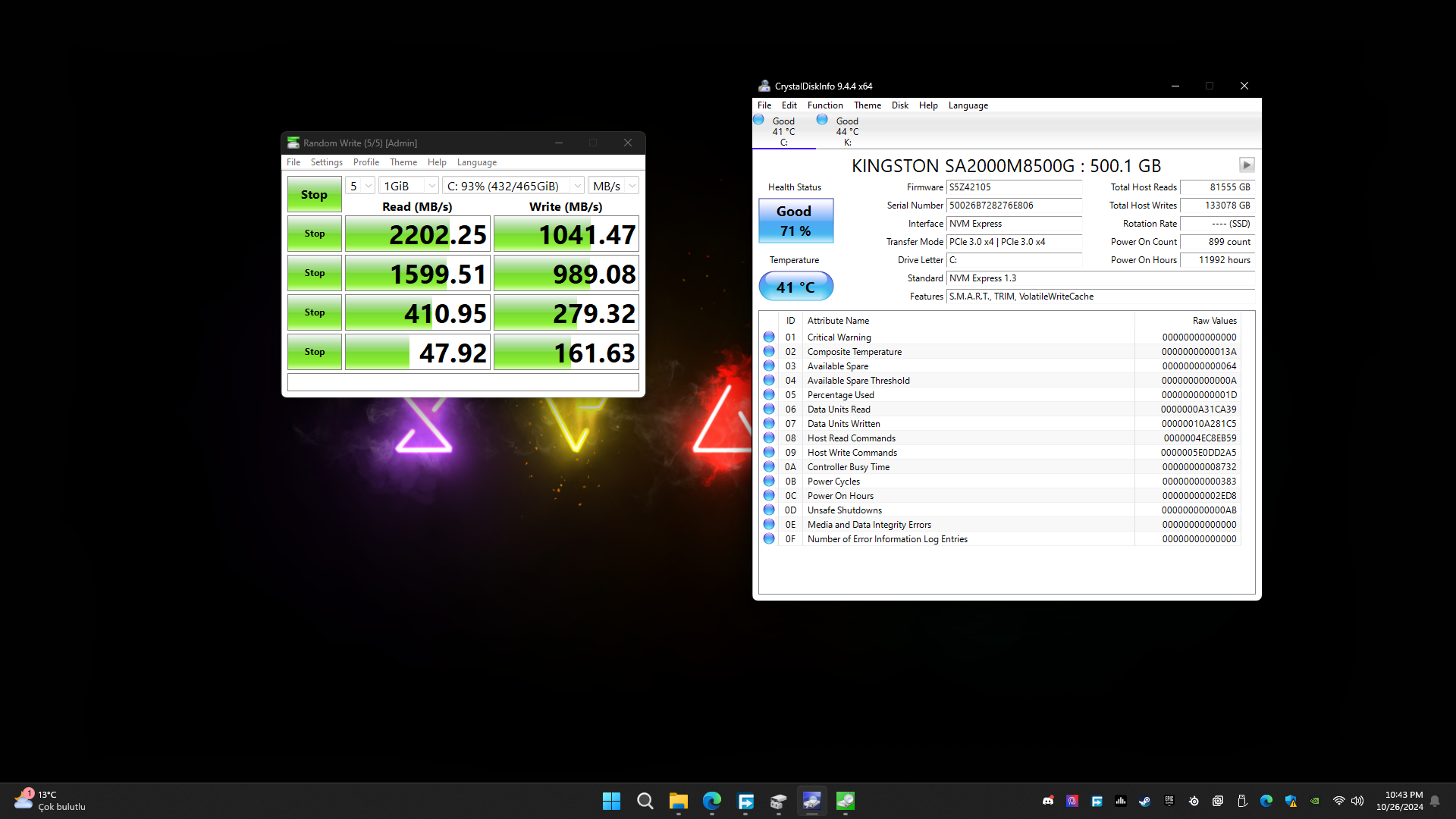 4 yıldır işletim sistemi + depolama olarak kullandığım A2000'in sağlık değerleri ve okuma yazma hızı ekte bulunmaktadır. Exceria G2 Crystal Disk Mark sonucu 62 dereceyi gördü. Normal mi demeliyim bilmiyorum ama Exceria G2 modeli normal M2 slotunda iken, A2000 ise soğutmalı slotta idi. G2'yi sadece oyun depolaması olarak kullanacağım, N11 üzerinden 1600 TL'ye aldım fiyatına göre çok iyi görünüyor ama uzun kullanımda ne olur bilmiyorum.