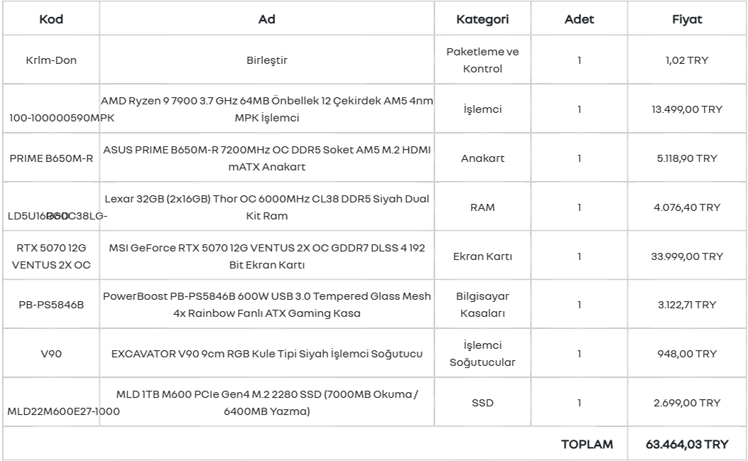 Max 65bin olacak şekilde bir bütçe düşünüyorum fakat değişiklik olabileceğinden dolayı 40 ile 65 bin arası sistem toplamayı düşünüyorum, aklımda eklediğim görseldeki sistem var, bir siteden siteden baktığım kadarı ile herhangi bir darboğaz olmuyor, kafamdaki soru ise daha uygun ve yakın bir derecede performansa bağlı darboğaz yapmayacak sistemler var mı? Oynayacağım oyunlar genellikle şunlar; GTA 5 Online, FiveM (RP için), Battlefield serisi, War Thunder, Garry's Mod (RP için), Kingdom Come: Deliverance 1-2, Rust, Rainbow Six: Siege, helldıvers 2 benzeri ve yeni çıkacak veya halihazırda çıkmış olan oyunlar için oyun oynamak amaçlı ve gelecekte de çok sıkıntı çekmeyeceğim bir bilgisayar toplamak istiyorum. Bilgisayarı nerelerden güvenli bir şekilde alabileceğimi bilmiyorum, mevcut bilgisayarımı İtopya'dan almıştım fakat servisine gittiğimde tek dedikleri şey format at veya kasanın içini temizle gibi laflar olduğundan pek güvenemiyorum.