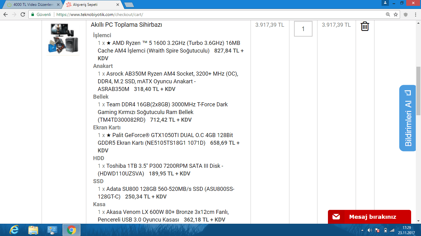 İşlemci: ★ AMD Ryzen ™ 5 1600 3.2GHz (Turbo 3.6GHz) 16MB Cache AM4 İşlemci (Wraith Spire Soğutuculu) - 208,00$ + KDV = 976,85 TL
