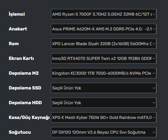 O yüzden 2.el sağlam SSD ve 2.el RX 7700XT veya https://www.sahibinden.com/ilan/iki...-phoenix-12gb-gddr6x-192-bit-1158164253/detay alınabilir.