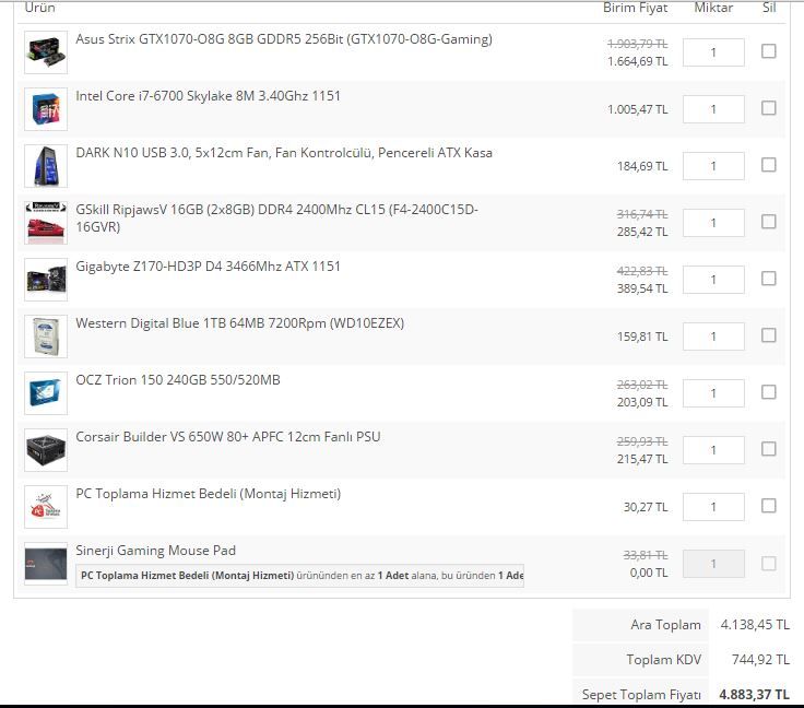 Hocam "K" ibaresi olmayan; yani OC yapamayacağınız bir işlemci için "Z" serisi bir anakart seçmek çok da mantıklı olmaz. Onu "H" veya "B" serisi bir anakart ile kısarak bütçeye biraz daha yaklaşabilirsiniz. Bir de bütçe dahilinde kalabilmek için sonradan değiştirmesi zor bir işlemciyi düşürmek yerine SSD gibi parçaları kaldırmak daha mantıklı olur. Güzel bir sistem olmuş bunun dışında; elinize sağlık.Hocam eğer bütçenizi arttırabilirseniz kendi toplayacağım sistemi öneririm buda sinerji'den. Eğer arttıramazsaız i7 6700 işlemci yerine i5 6600 koyabilirsiniz.Eki Görüntüle 178351