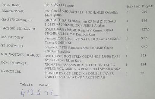 | Ram | Kingston HyperX fury 8gb 2133 mhz cl 14 | 115 tl |