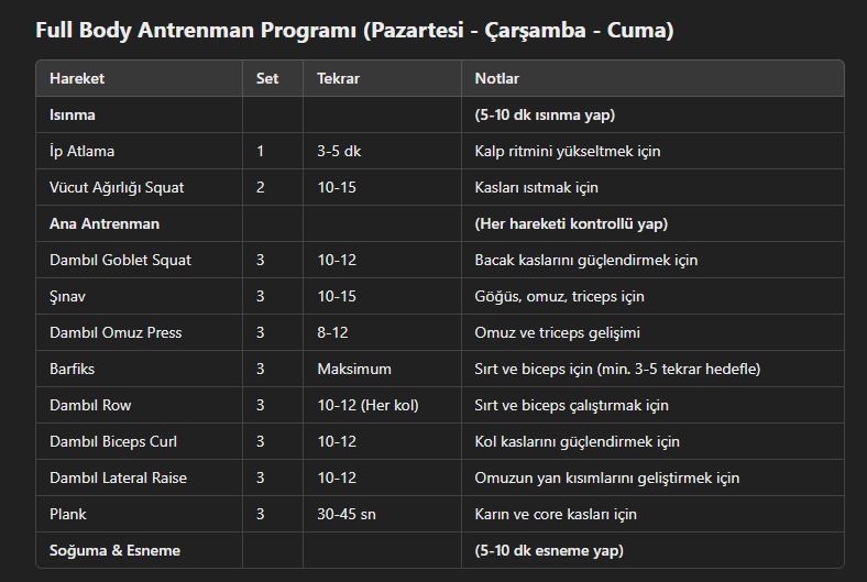 Arkadaşlar bu sıralar kendimi zayıf hissettiğim için bir motivasyon ile spor yapmaya başladım evde kendi çabalarımla. ChatGPT bana alttaki gibi bir program hazırladı. Bunu haftada 3 gün olacak şekilde full body çalışarak sürdüreceğim, işe yarar mı sizce? Bir de ben bu yapacağım sporun yanında bol protein ve karbonhidratlı besleniyorum artık. Şu anda 58 kiloyum, boyum 180 olduğu için çok zayıfım. Bu yüzden yaz sonuna kadar en azından 65 olmak istiyorum ve bu almış olduğum kiloyu sağlıksız almak istemiyorum. Sizce 5 ayda bu kadar kilo alabilir miyim? Ayrıca evdeki malzemeler 2 adet 5kg dambıl, IP atlama ipi, barfiks ve direnç bandı. Eğer ayrı bir program önerecek olursa öneriye açığım.