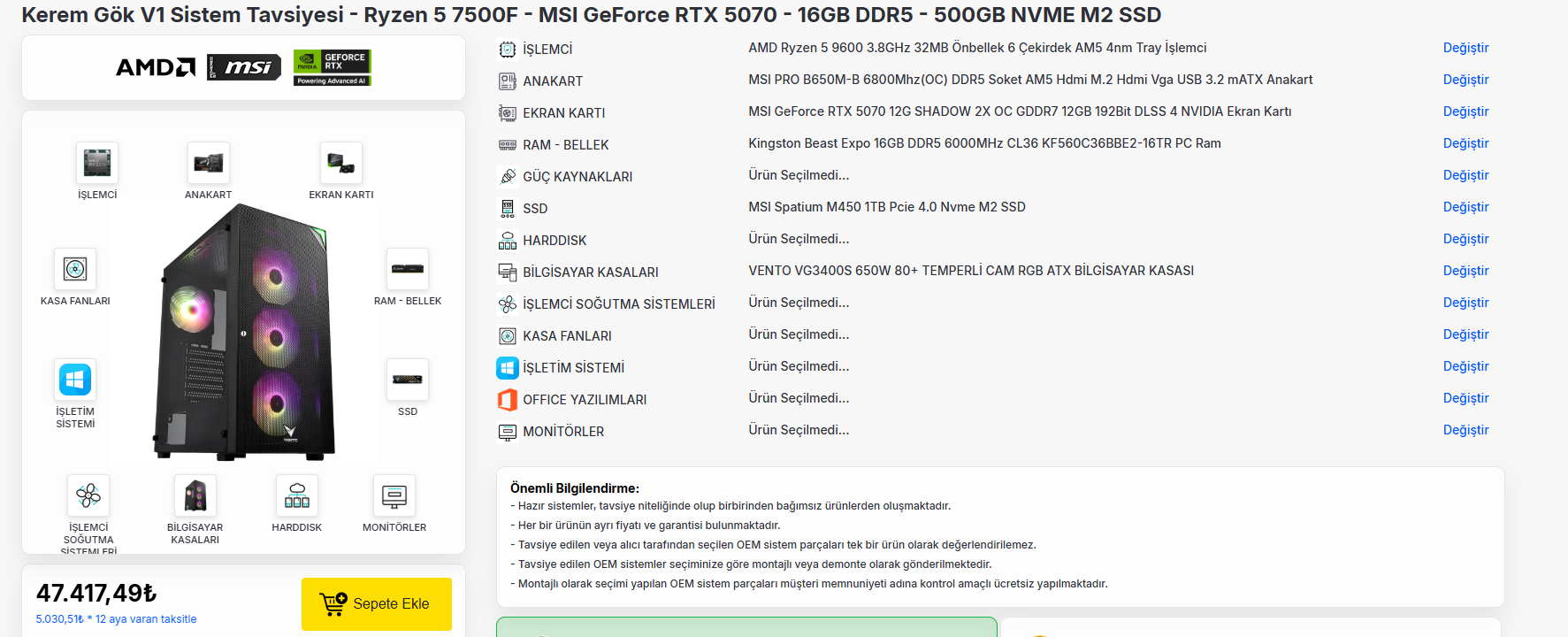 5070 li sistemin ssdsini 1 tb ramini de 32 gb yapıp alabilirim fiyatı tam 50-52k bandında tutup. ve 5070 12 gb ile 5060 ti 16 gb arasında çok bir fark var mı acaba? gbsinden ötürü düşünüyorum pek bir bilgim yok saçma bir soru ise maruz görün.