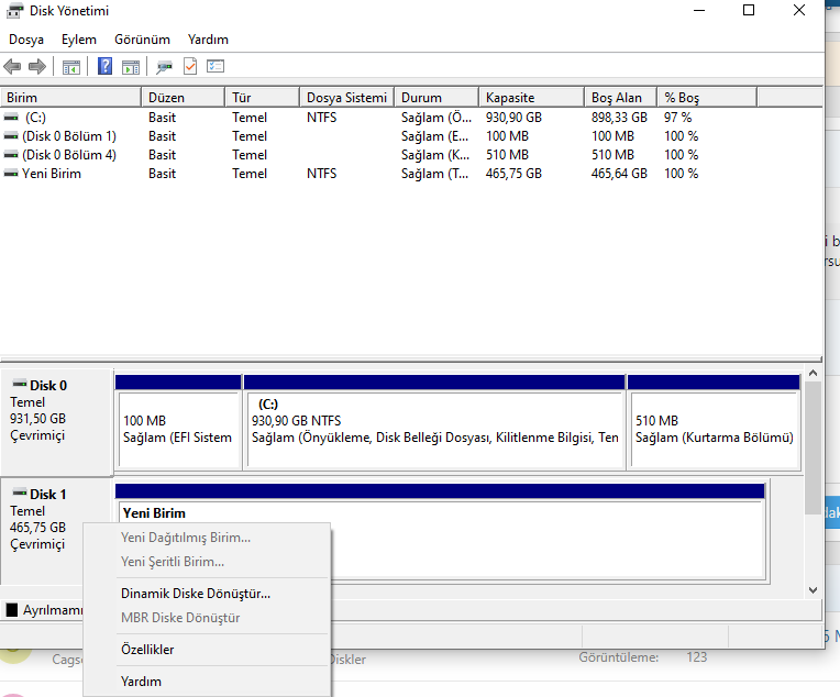 Bilgisayar yönetiminden disk yönetiminin fotoğrafını atabilirmisiniz?