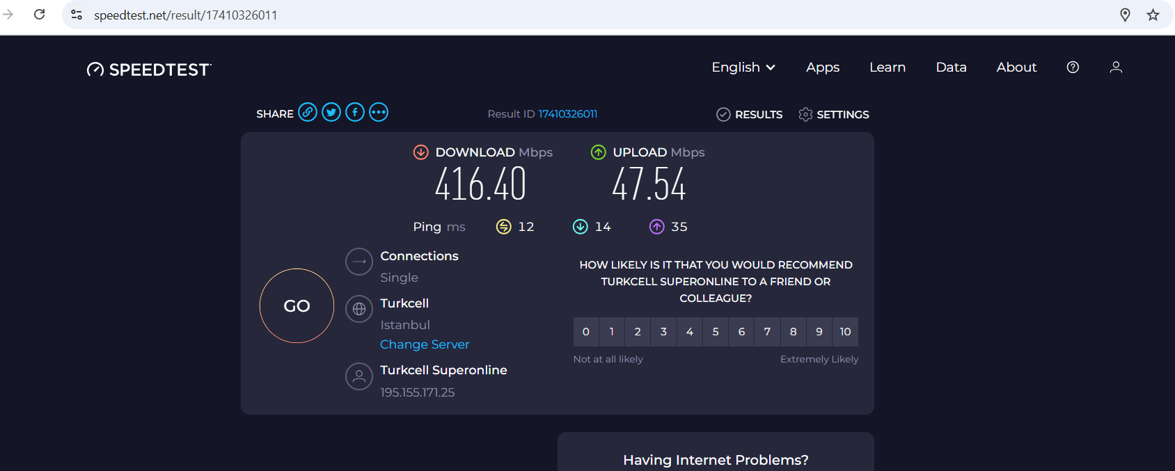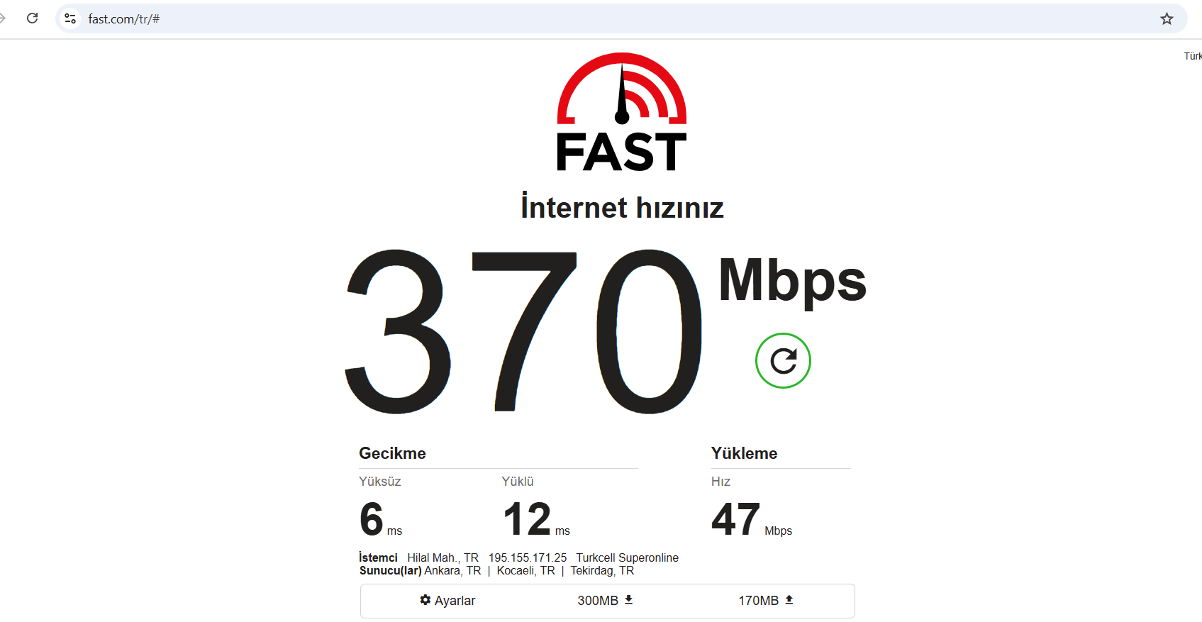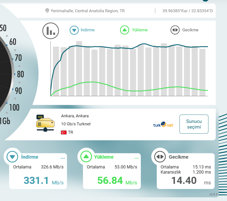 Merhaba. Superonline'ın 500/50 paketine geçtim ancak Wi-Fi'da hız 320-340 Mbps dolaylarında. Kablo ile bağladığımda ise 468 Mbps çıktı sonuç. Modem (router) ZTE H267a. Bilgisayarın Wi-Fi kartı Wi-Fi 6 AX destekliyor. Testleri Speedtest aracılığıyla Single modda yaptım. Farklı serverlar aracılığıyla hem kablolu hem de kablosuz test sonuçlarımı aşağıya bırakıyorum. Ankara'da yaşıyorum. Bazı testlerde İstanbul server da seçtim. Turkcell dışında server seçtiğim testler de var. Ekran görüntülerinin isimlerinde farklı servis sağlayıcıların ve farklı lokasyonların bilgisi yer alıyor. Bu değerler normal mi? Siz 500 Mbps veya 1 Gbps internet paketlerinizde Wi-Fi hızı olarak kaç değer alıyorsunuz?
