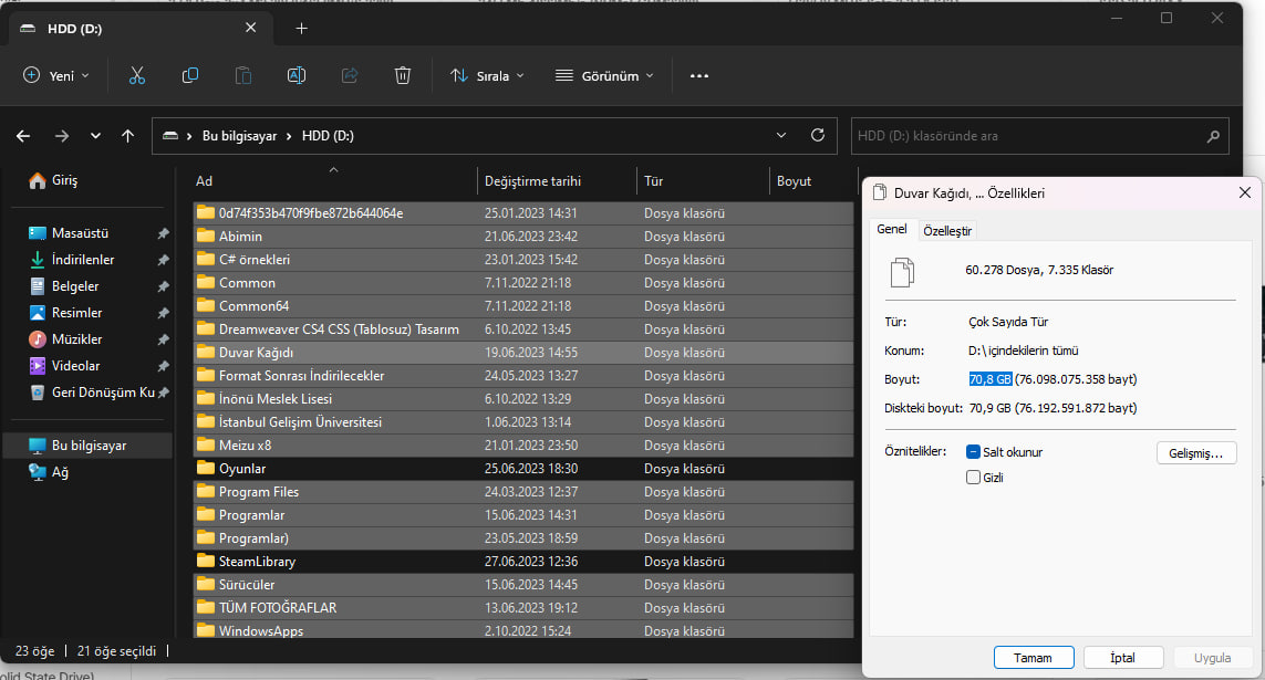 Oyunlar dahil programların HDD'de kapladığı yer.