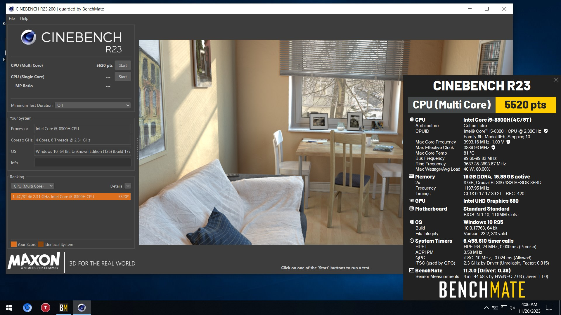 LittleWarlock`s 5520 cb score: Cinebench - R23 Multi Core with BenchMate with aCore i5 8300H