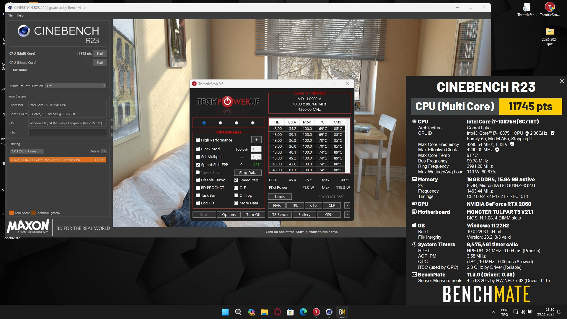 LittleWarlock`s 18630 cb score: Cinebench - R23 Multi Core with BenchMate with aCore i5 13500