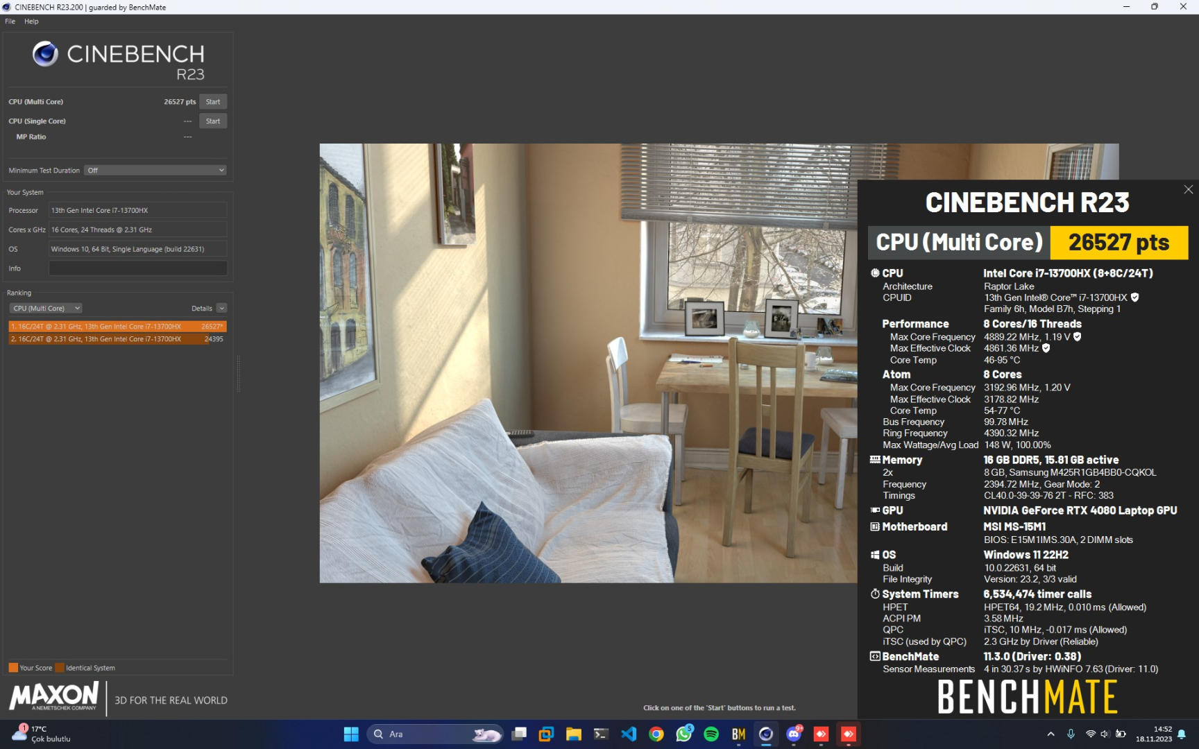 LittleWarlock`s Cinebench - R23 Multi Core with BenchMate score: 26527 cb with a Core i7 13700HX