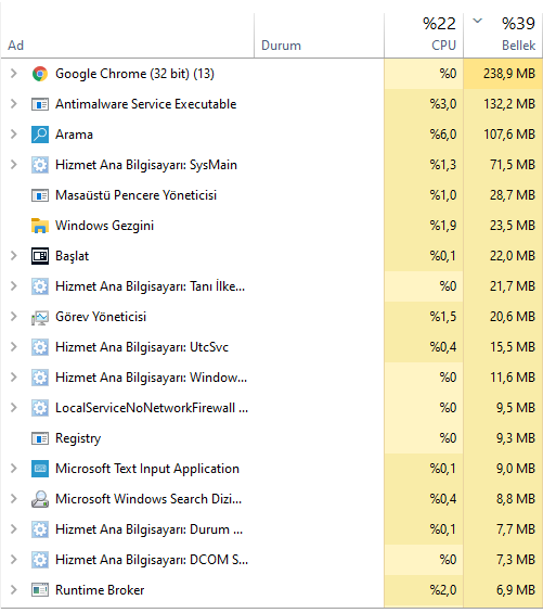 Kullanılan değerler gayet normal 6 GB RAM ile Windows 10 kullanıyorsunuz ve virüs koruması çalışır durumda ayrıca Chrome da 13 sayfa açık.