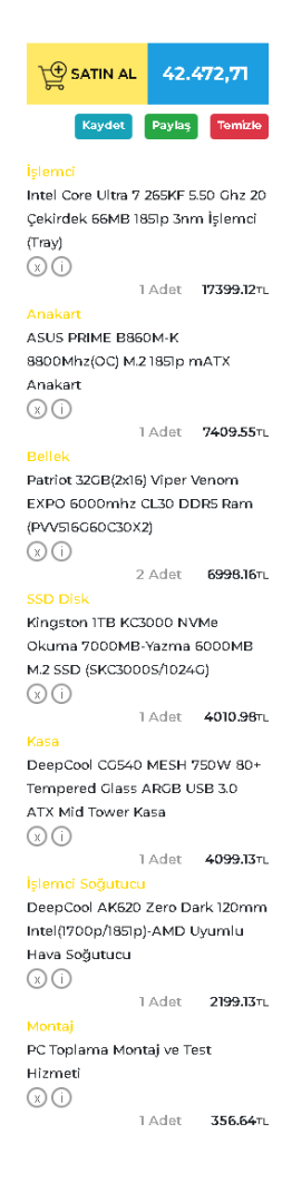 Böyle bir sistem buldum ve kafamda oluşturdum. Benim için öncelik render performansı. RAM olarak da 64 GB almayı düşünüyorum. Corsair markası konusunda çok düşündüğüm için çıkmaza girdim ve ne yapacağımı bilemiyorum. Şu an işin ehli kişilerden yardım almak istiyorum. Darboğaz olur mu diye biraz endişeliyim. Bütçem kasa için 50-60 bin TL arası. Şimdiden çok teşekkür ediyorum.
