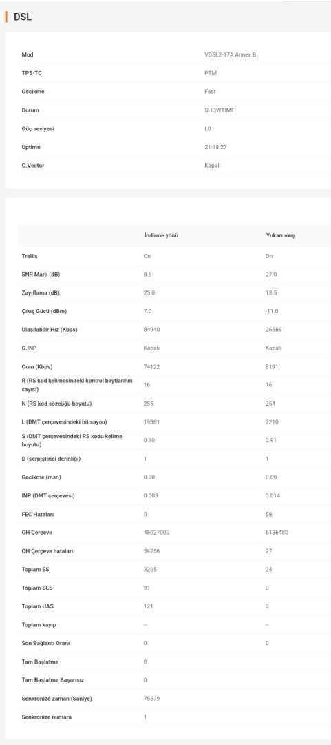 SNR margin değerleriniz normal ama hat zayıflamanız çok yüksek. İç tesisat veya port kaynaklı sorun olabilir.