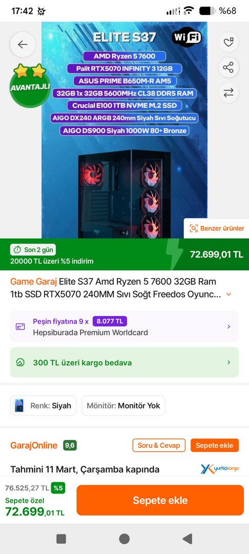 Hocam 70.000 e dustu bu sistem konudaki indirim kodunu kullanirsaniz 1000tl indirim yapiyor kesinlikle rakipsiz bu butcede 32 ram 240 ve 1000w psu ile. Ben almistim elime ulasti iscilik sikintisi vb yok.Elektronik: R5 7600 32 GB RAM 1TB SSD RTX5070 240mm SIVI SOĞUTUCU Sistem 71.399 ( 9 Taksit)