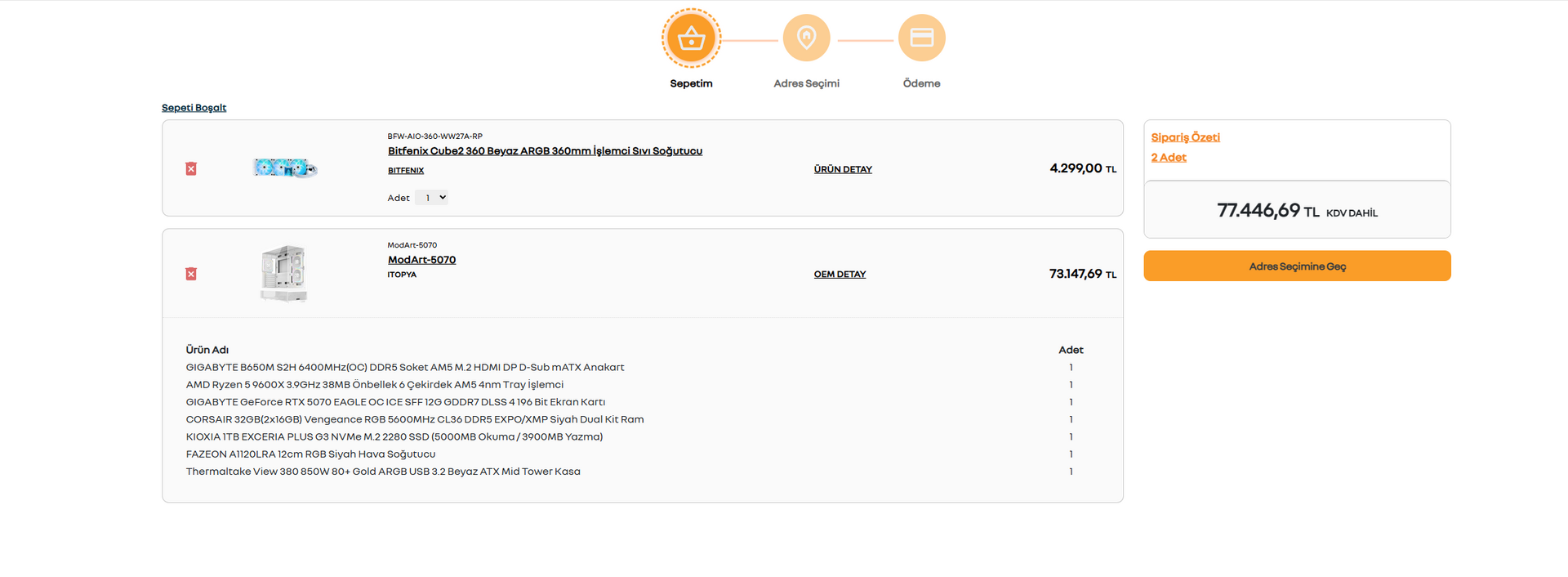 Hocam bu sistem daha mantıklı gibi anakart ve ram harici bütün parçalar beyaz oluyor ve 73,147 TL'ye geliyor.İşlemci: amd ryzen 5 7600x ama ana kart beyaz olsun diye biraz pahalı oldu, bence ana karttı kısıp işlemci daha iyi alabilirsin