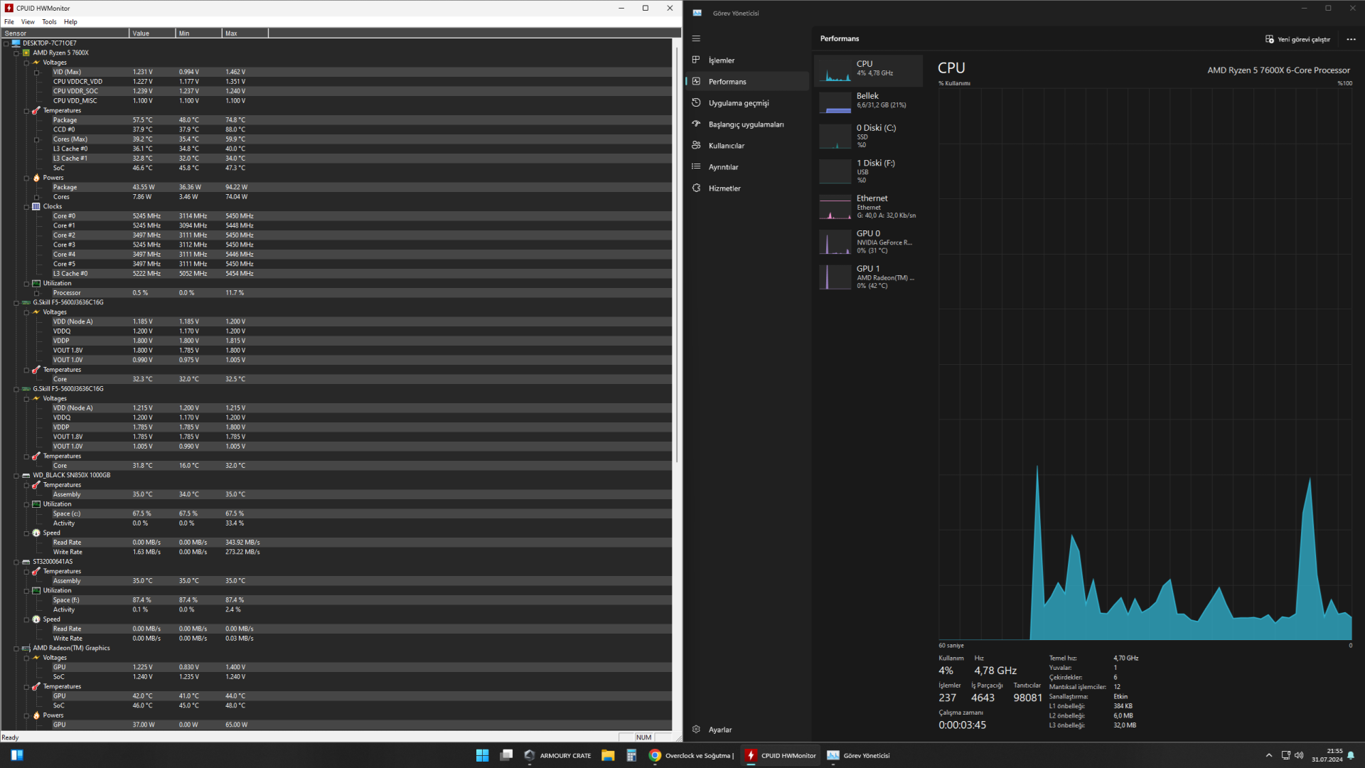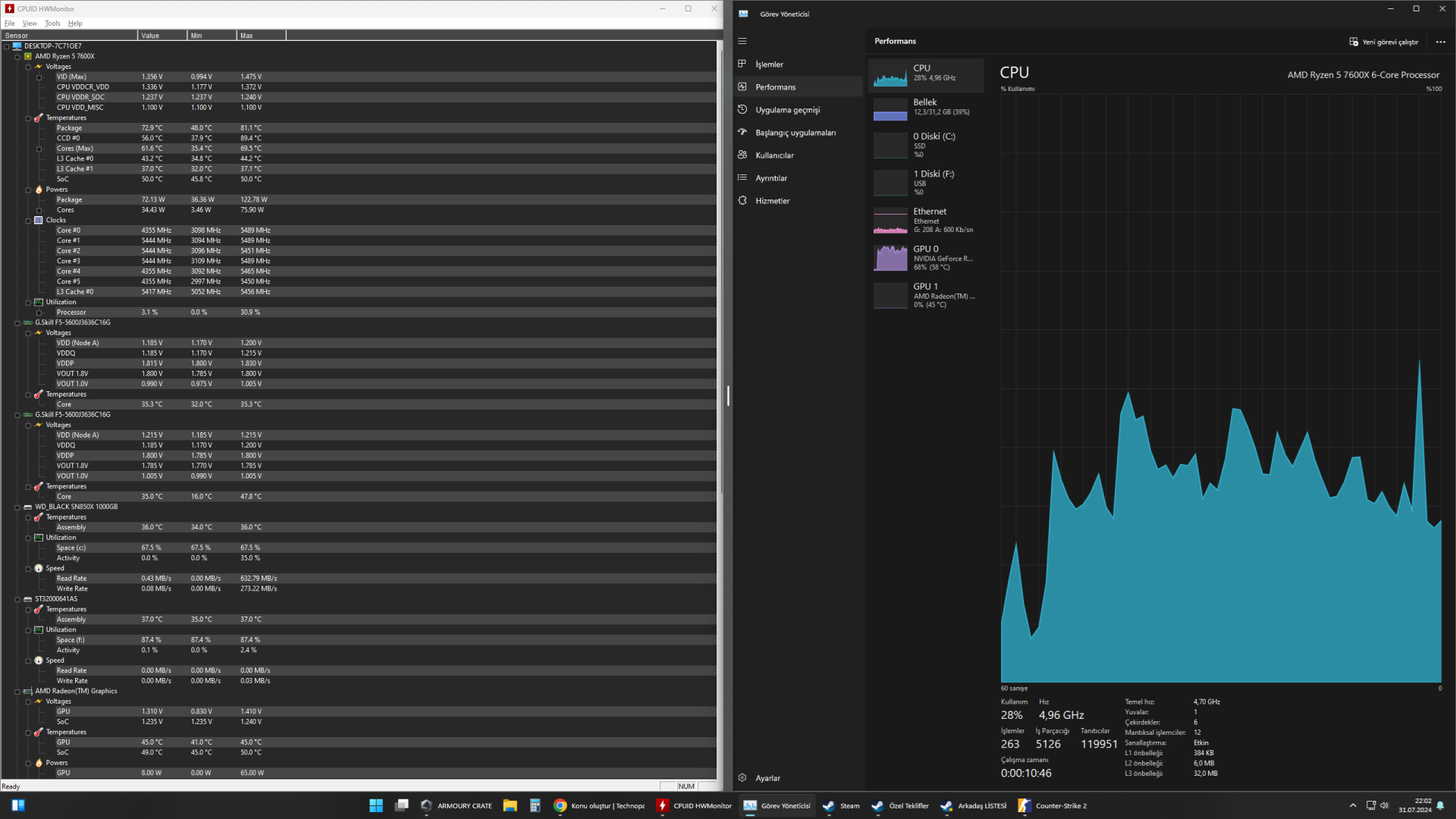 İmzamda yer alan sistemi kullanıyorum. 7600X işlemciyi ASUS TUF LC240 sıvı soğutma ile kullanıyorum. Ekte sistemi açar açmaz işlemcinin ulaştığı değerlerin ekran görüntüsünü ve 5 dakika CS-2 oynadıktan sonra ulaştığı sıcaklık değerlerini koydum. Sizce normal mi? ASUS ile video yoluyla iletişime geçtim sıcaklık değerlerini paylaştım ve normal geri dönüşü aldım. Fakat bana pek normal gelmedi. Ek olarak overclock işlemi mevcut değil yalnızca XMP twaked açık. Ekstra bir işlem yok.