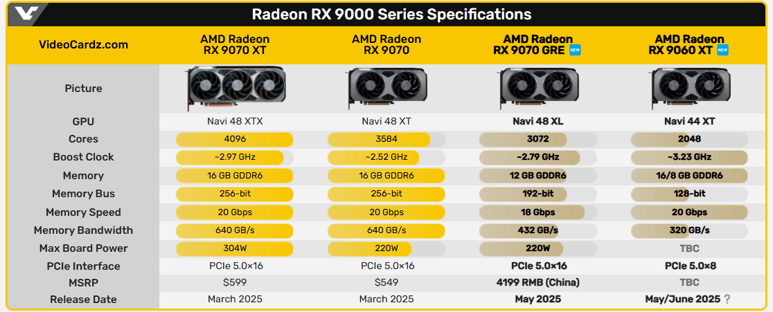 7000 serisindeki gibi. 9060 XT ile 9070'in arasına konumlandı. Navi 48 tabanlı, 7900GRE'den %5-10 kadar daha güçlü ama 12 GB 192 bit.