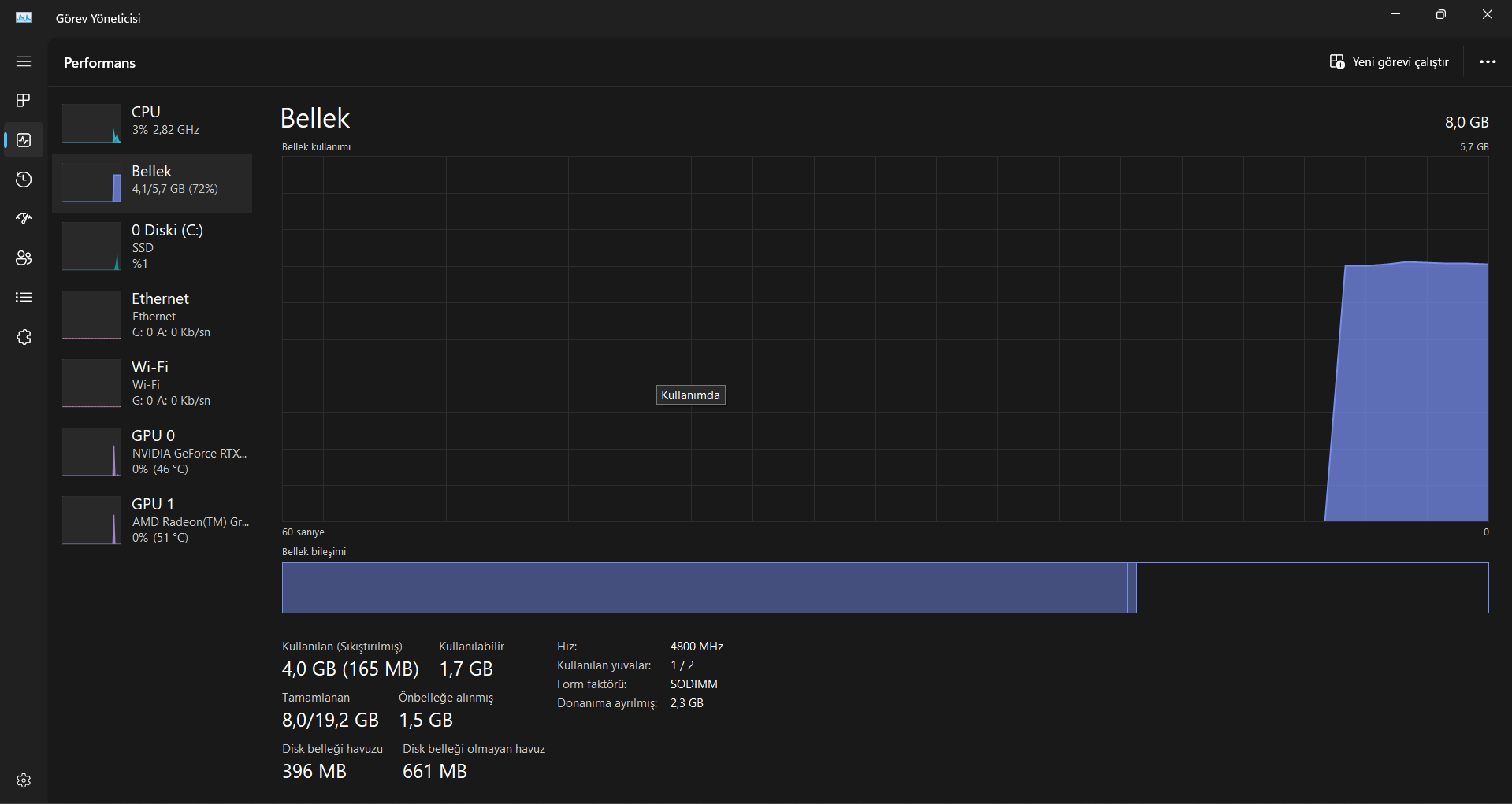 ASUS TUF Gaming A15 FA507NV model bilgisayarımda 8 GB RAM var fakat görev yöneticisinde 5,7 GB ı kullanılabilir görünüyor. Bu normal mi? Normal değilse nasıl düzeltilebilir? İnternette BIOS'tan düzeltmeyle ilgili bir şeyler gördüm ama benim bilgisayarıma uyumlu bir yol mu bilmediğimden buraya soruyorum. Eğer bu çözüm yolu veya başka yol uyumluysa bilgisayara herhangi bir zararı olur mu?
