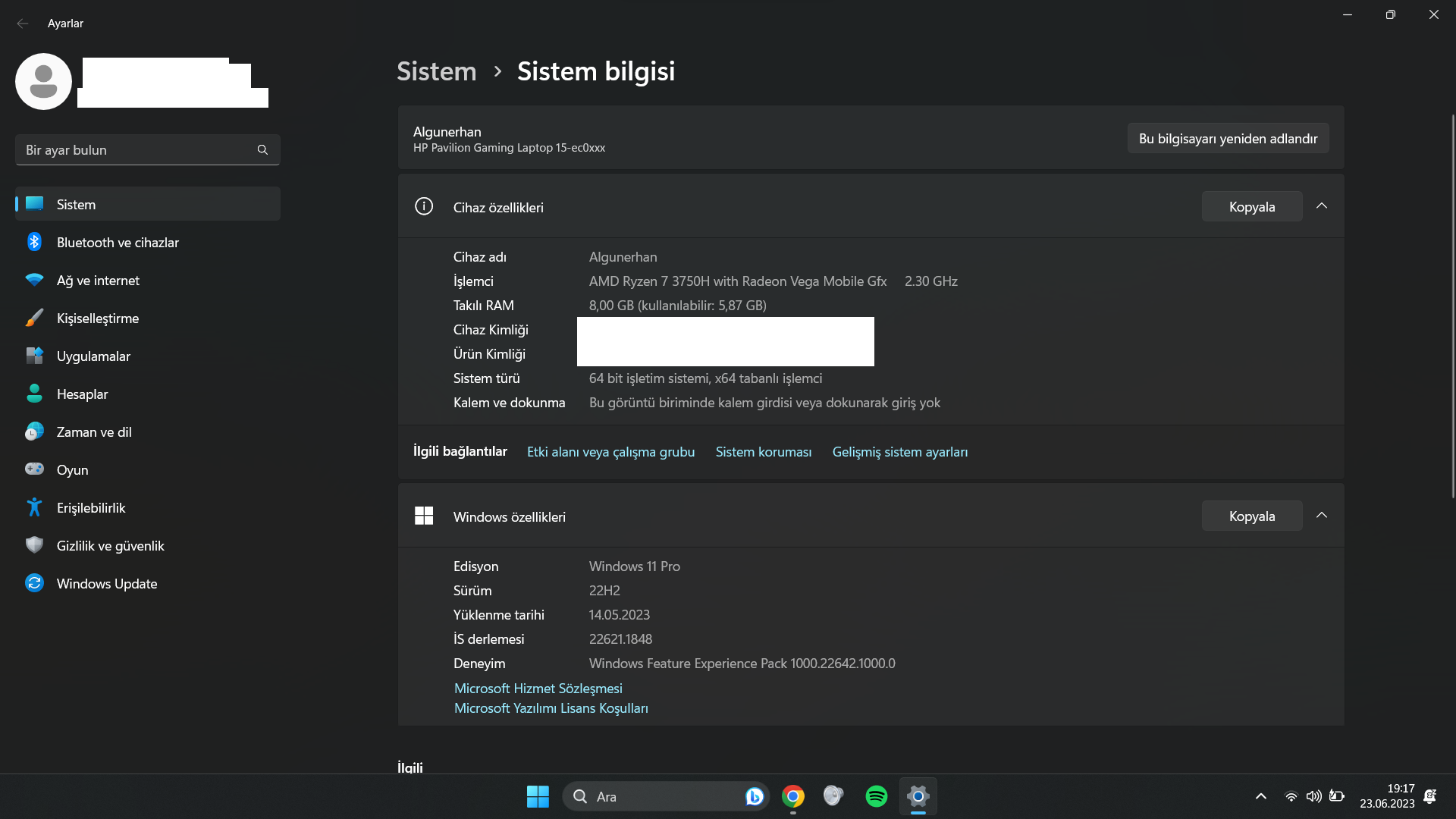 Sistemde 8 GB RAM olmasına rağmen kullanılabilir RAM mikarını 5,87 GB olarak gösteriyor. Marka: HP.