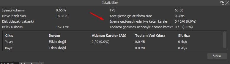 OBS Studio'da İstatistikler kısmı var. İşleme gecikmesi kısmı kırmızı oluyorsa işlemci ile alakalı bir sorun oluyordur. Çıkış ayarlarında CPU Kullanım ön ayarıyla oynadıysan oraya bak.