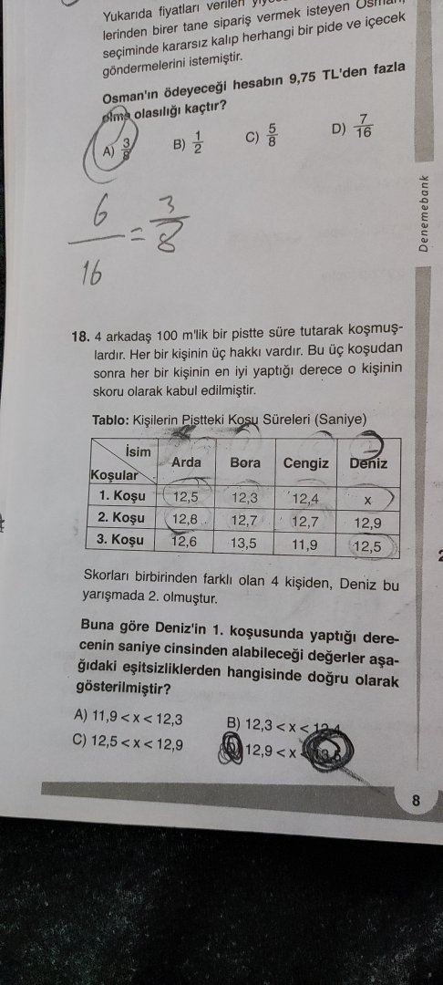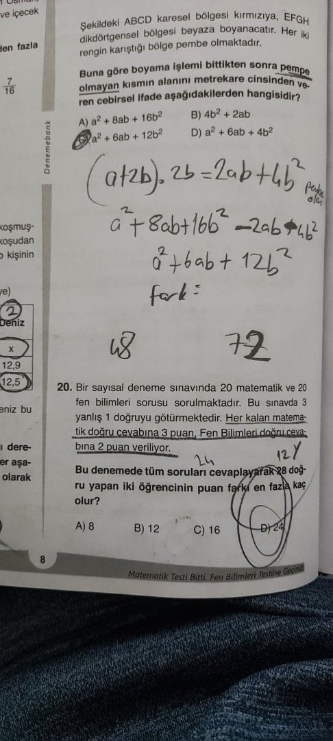 Merhaba. Aşağıdaki sorular bugün yaptığım sayısal denemesindeki matematik yanlışlarım. 15. soruyu yanlış yaptığımın farkındayım fakat nasıl A olabilir?