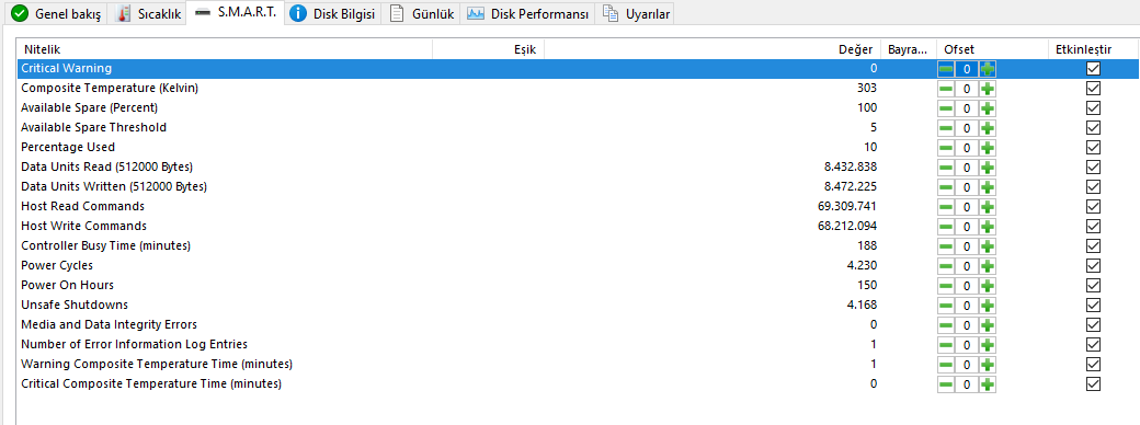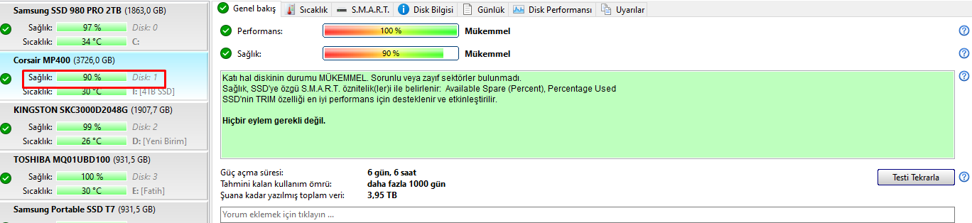 Sizde yazma miktarı 4 TB yani daha yazma ömrünün çok çok küçük bir kısmı dolmuş durumda.