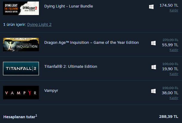 900 TL bütçem var. 950 TL'ye de çıkartabilirim. Steam sepetim bu şekilde. Ekle ya da kaldır dediğiniz oyun var mı?