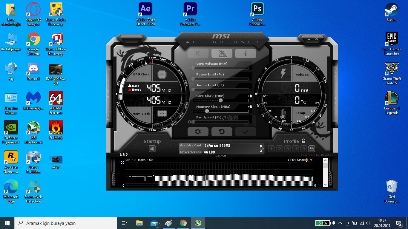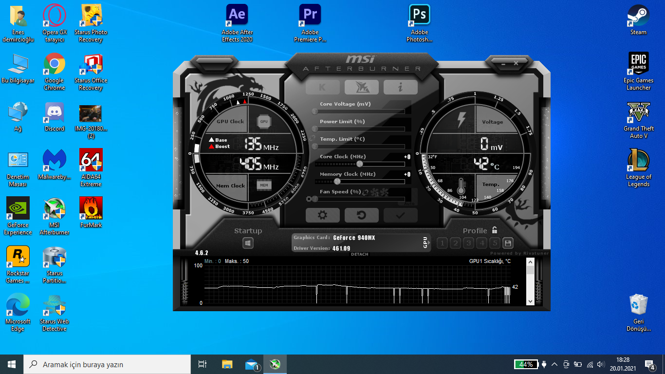 Benim sorunum laptopumun son zamanlarda fazla ısınması olarak düşünüyordum fakat geçenlerde FurMark stres testini yaptığımda ekran kartımın sıcaklığının 71 dereceyi geçmediğini fark ettim. Fakat en basitinden LoL'e girsem bile 90 dereceleri buluyor, bugün ise şöyle bir şey fark ettim. Ekran kartı sıcaklığımı MSI Afterburner'den ölçerken derecenin aniden 0'a, MHz'in de aniden boostlandığını gördüm. Aşağıdaki görseldeki gibi, bunun tam olarak sebebi ne olabilir bilgilendirirseniz sevinirim.
