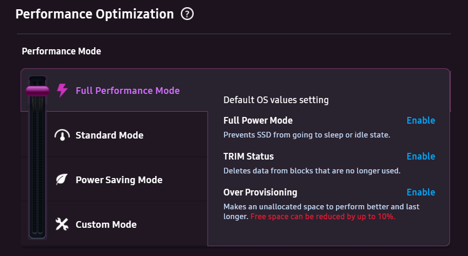 980 Pro 500 GB modeli kullanıcısıyım. Full performance mode açık durmalı mı yoksa standart haline mi döndürmeliyim?
