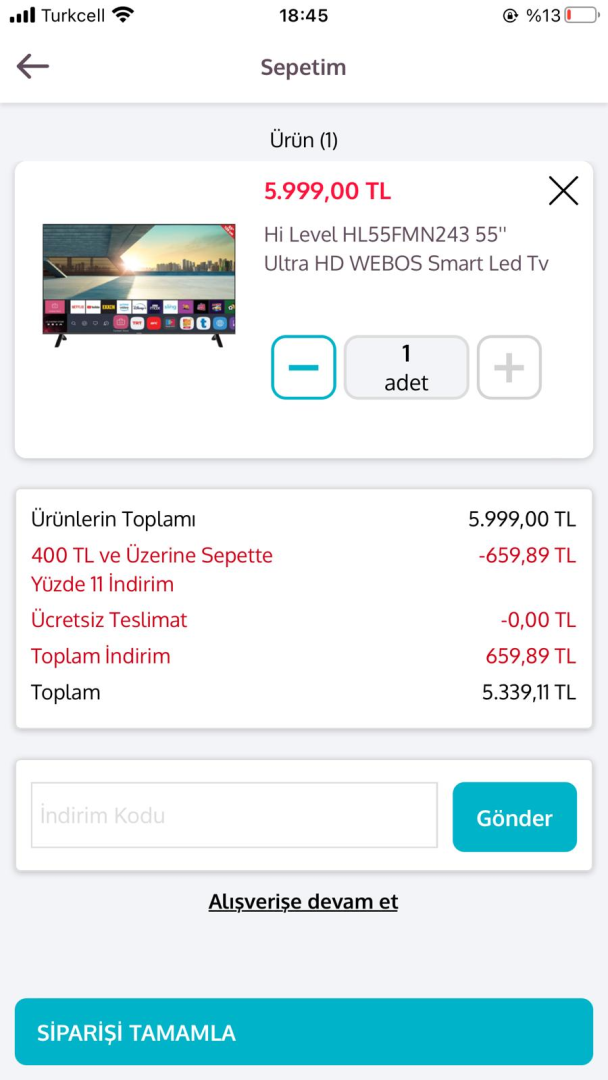 A101 Kapıda uygulamasında 400 TL üzeri %11 sepet indirimi varmış.