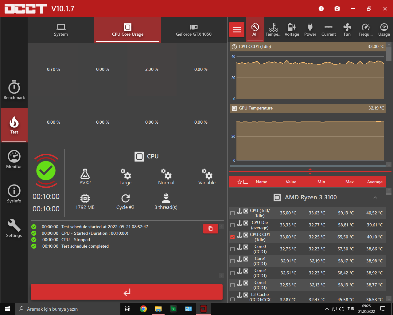 Prime95'i indirdim fakat arayüzü olsun, kullanımı olsun beceremedim. OCCT ile 10 dakikalık stres testi yaptım. Sistemim SSD'ye kurulu. Şuan PC'de sadece SSD ve HDD var.