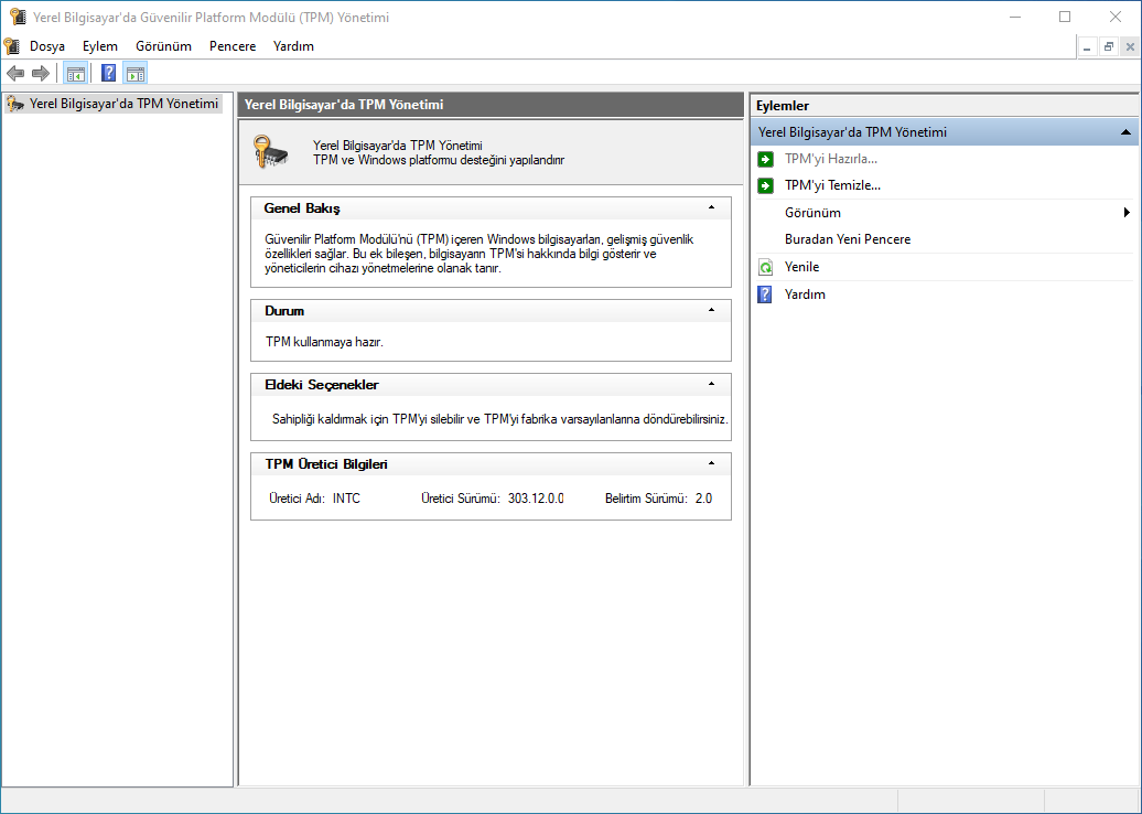 BIOS'tan TPM'yı disableden enableye çektım. TPM 2.0 var mı yok mu nasıl görürüm bilmiyorum. WhyNotWin11 de açılmıyor. Eskiden açılıyordu oradan göremiyorum. Onun dışında başka nereden görebilirim TPM 2.0 var mı yok mu?