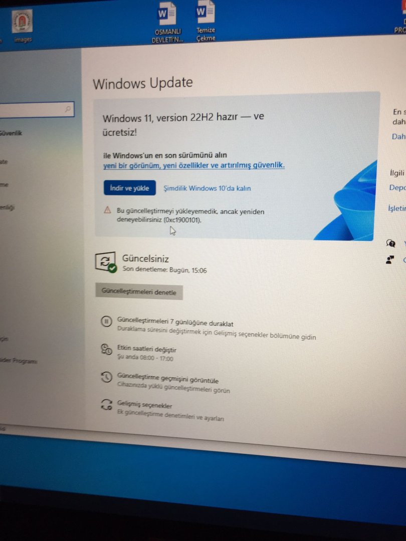 Bir kez daha denedim ve geri yükleme yaparak Win10'a döndü. Fotoğraftaki hatayı verdi ve "bu güncelleştirmeyi yükleyemedik, ancak yeniden deneyebilirsiniz (0xc1900101)." şeklinde bir mesaj verdi.