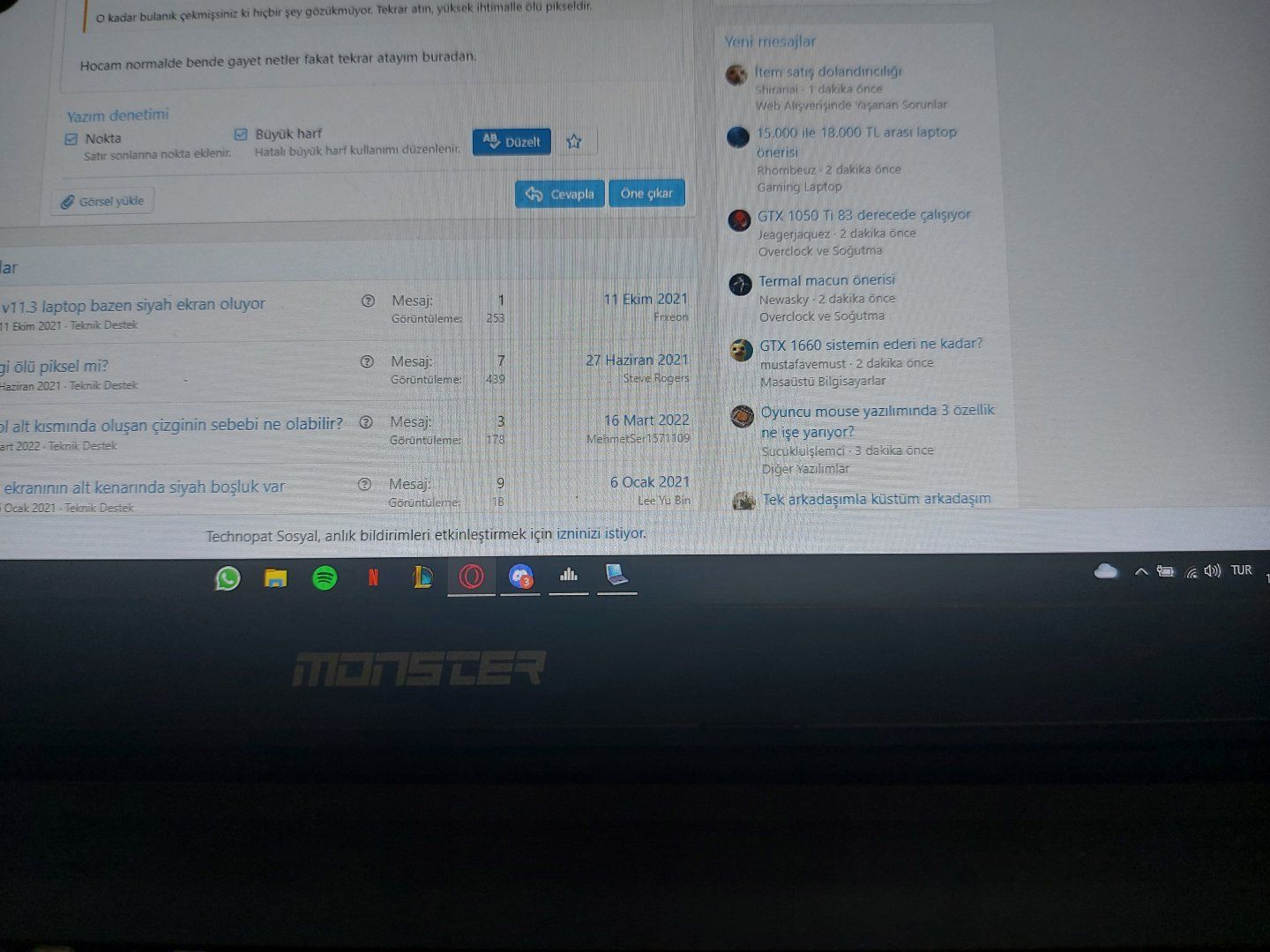 Selam Monster Abra A7 V7.1 laptop kullanıyorum. Şu sıralar laptopun ekranının alt kısmında siyah siyah şeyler var. Fakat her ekranda çıkmıyor bazı renk olan ekranlarda çıkıyor. Örnek olarak Discord'un en alt kısmında veya Sea of Thieves oyununda suya falan baktığımda çıkıyor fakat Google'da vs. çıkmıyor. Bu nedir ölü piksel midir yoksa başka bir şey mi? Ve ben düzeltebilir miyim yoksa teknik servise mi göndermem gerekir?