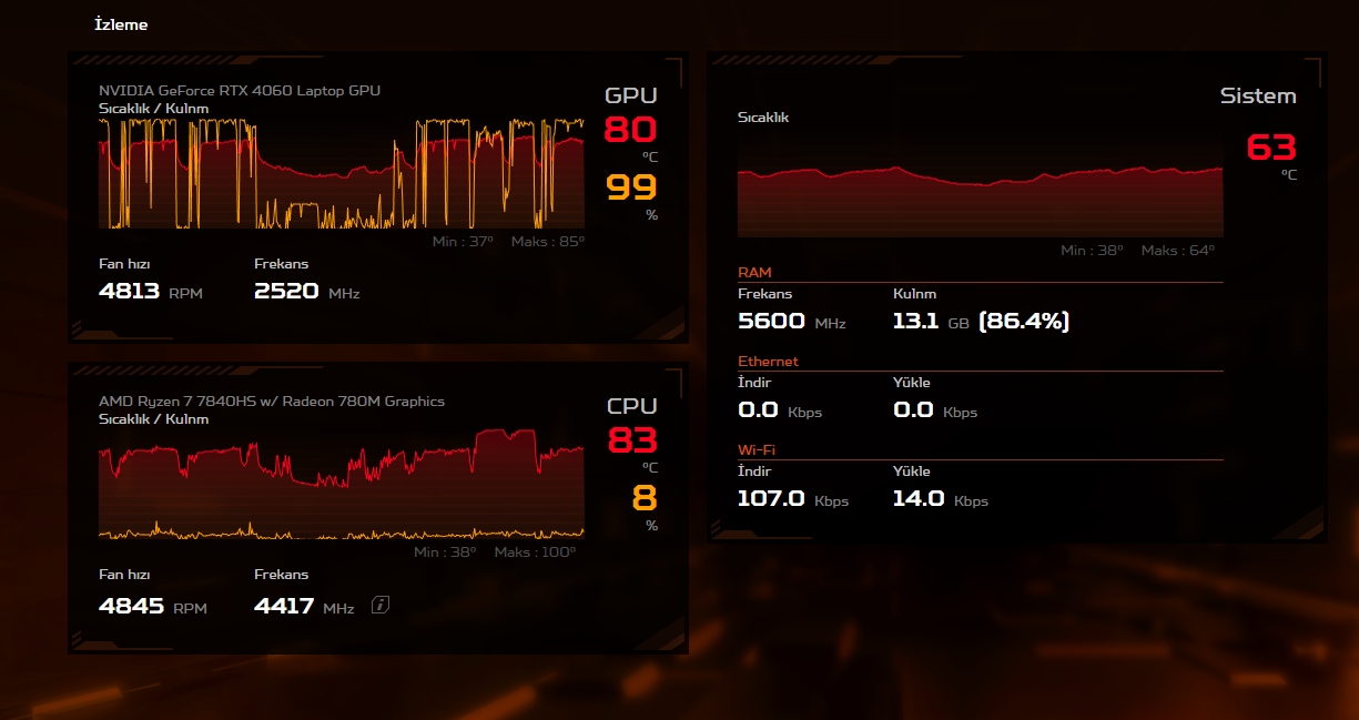 Şu ana kadar sadece GTA 5 indirebildim. GTA 5 (bütün seçenekler ultrada, MSAA ve post FX hariç) oynarken performans seçeneği açıkta ekran kartım 59 derece oldu. Bundan yana hiç problem yok. İşlemcim ise 70-94 arası geziniyor. 90 civarında çok uzun durmuyor, geri düşüyor hemen ama zarar görsün istemiyorum arkadaşlar. Zaten yeni almışım. Turbo'da kullan derseniz de yurda döneceğim, arkadaşlarımı rahatsız etmek istemem.