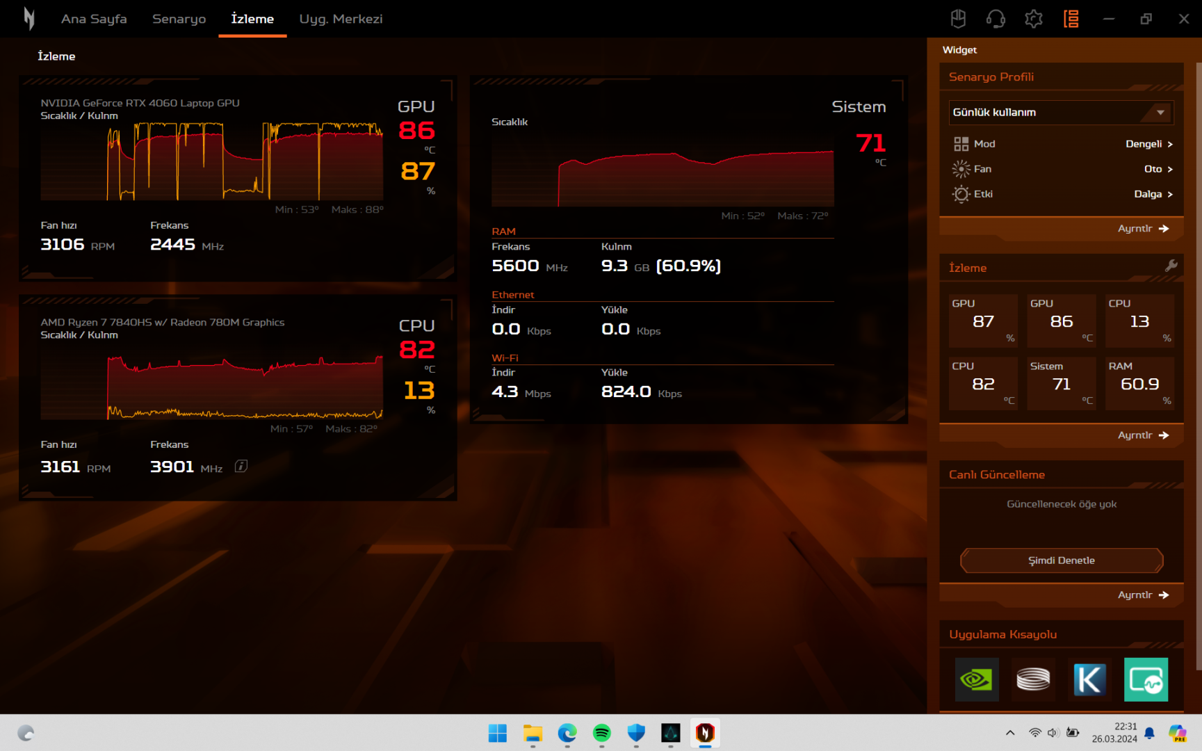 Acer Nitro 16 FC24 oynarken ekran kartı 89 derece oluyor