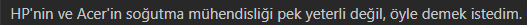Komik gelen şey bana "HP avukatı" demeniz. Ayrıca yaptığınız yorumlar çok genelleme içeriyor. "HP ve Acer'in soğutma mühendislikleri yetersiz" diyorsunuz benim bundan ne anlamamı bekliyorsunuz? Bende sizi normal bir dille uyarıyorum.