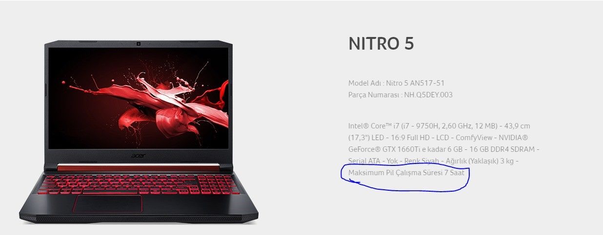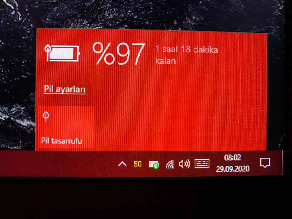 Merhabalar, Acer Nitro 5 AN517-51 Model i7 9750H İşlemcili GTX 1660Ti ekran kartlı ve 16GB Ram'lı bir leptopa sahibim. CMD Komut satırı ile pil kapasitesini sorguladığımda %96'lık kapasitede olduğunu gördüm bataryanın fakat tam şarj olduktan sonra okula götürdüğümde klavyenin parlaklığını kapatmama ekranın parlaklığını en düşük seviyeye çekerek ve güç tasarrufu ve pil tasarrufu modlarını açarak normal windows kullanımında 1.5 saatte tamamen dolu batarya bitiyor. Ürünün teknik özelliklerinde şarjının 7 saat gittiği söyleniyor. Bu konuda ne yapmam gerekiyor? Gerçekten çok sıkıldım bu durumdan. Bu kadar pahalı bir cihazın batarya performansının bu kadar kötü olması çok can sıkıcı bir durum. (2 sene garantisi devam ediyor.)