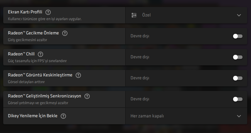 Dahili: Vega8 - Harici: RX560X 4 GB - Ryzen5 3550H CPU sistemli bir oyuncu laptopum var. Valorant oyununda 100-120 arası FPS alıyorum düşük ayarlarda. Bir arkadaşımın önerisi üzerine AMD uygulamasından Valorant oyununu seçerek bu ayarları yaptım. Aşağıya ayarların resmini koydum.