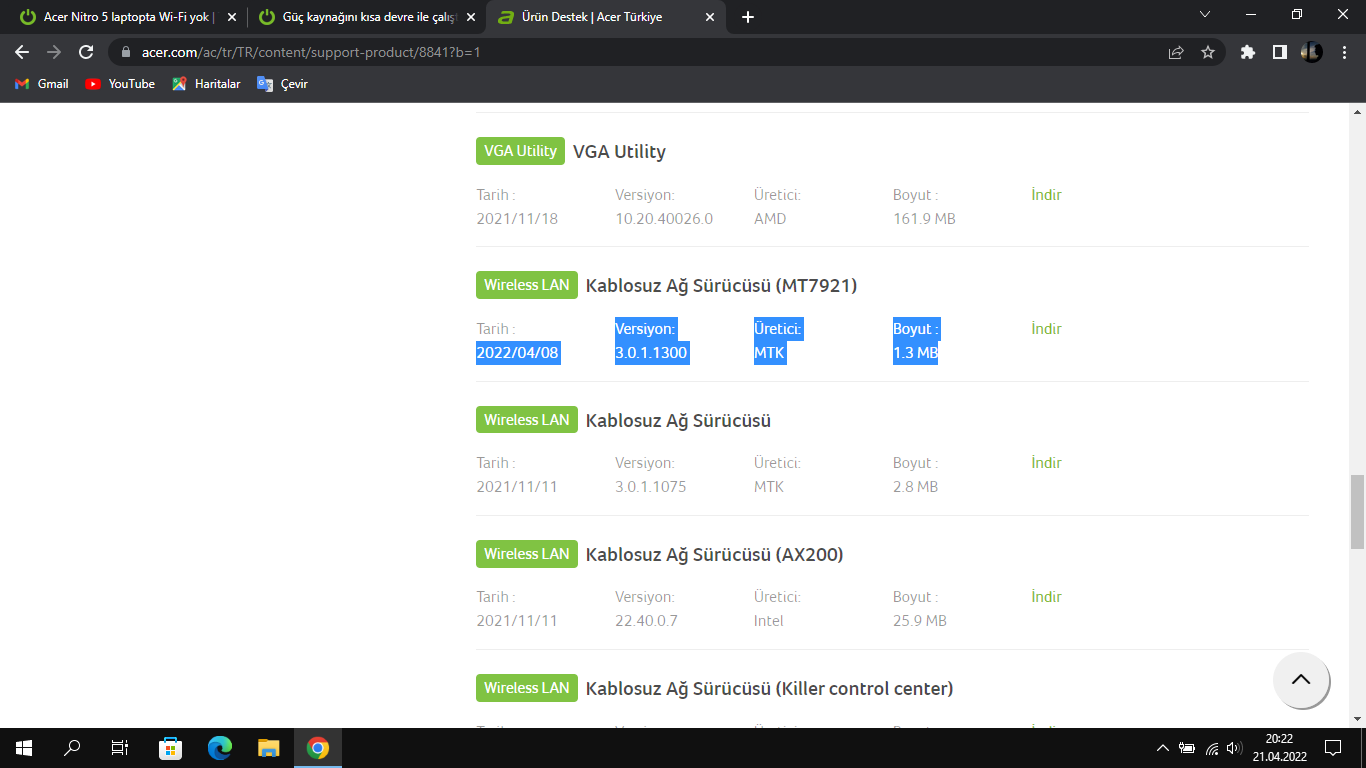 Acer Nitro 5 laptopta Wi-Fi yok