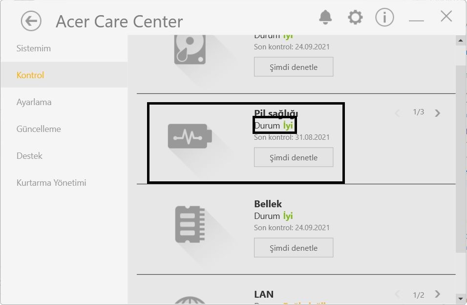 Birde Acer Care Center Programı ile bataryanız test edin.