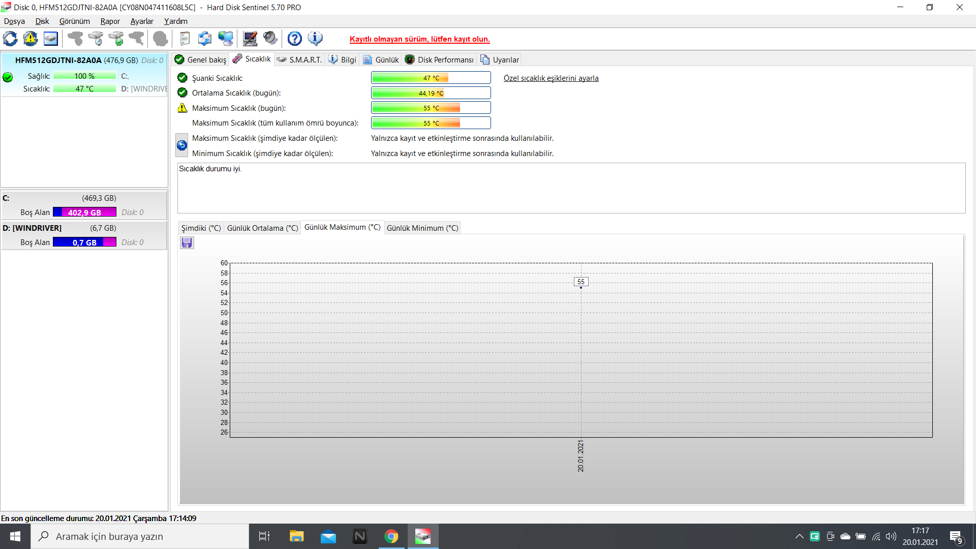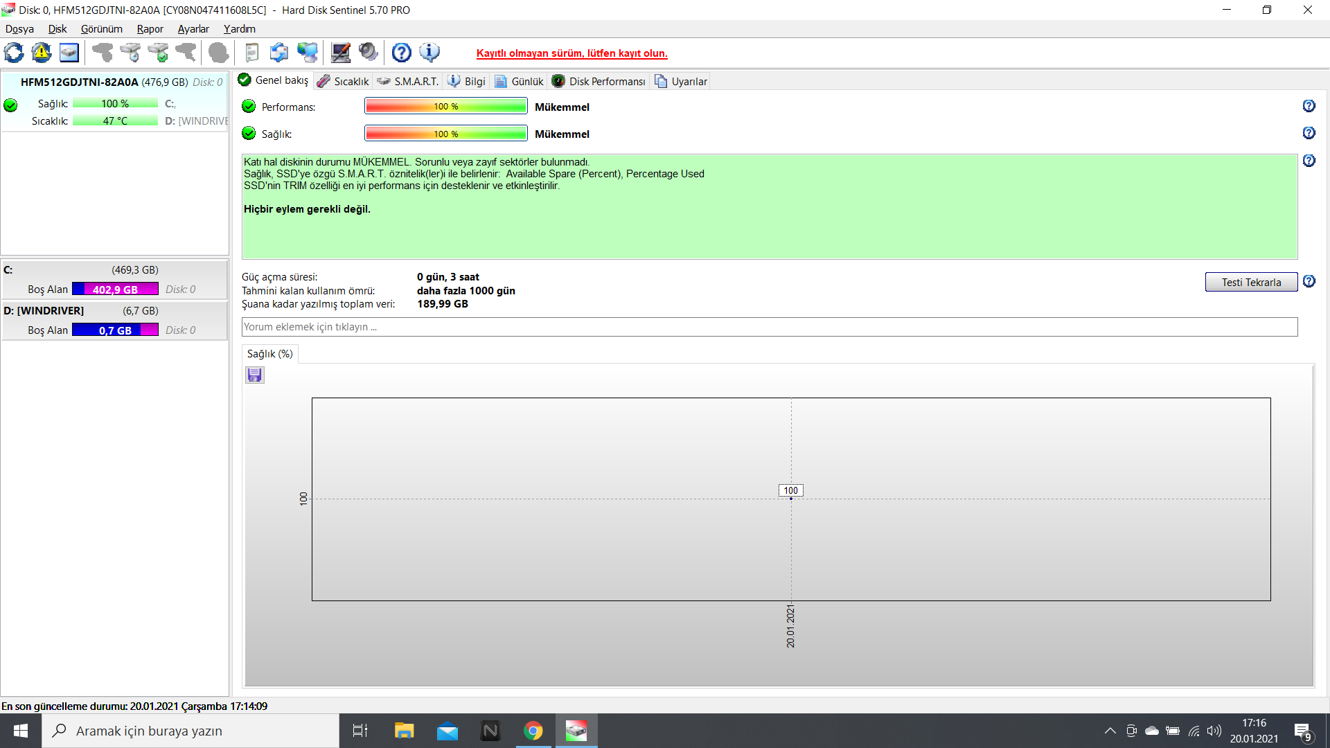 Katı hal diskinin durumu MÜKEMMEL. Sorunlu veya zayıf sektörler bulunmadı.