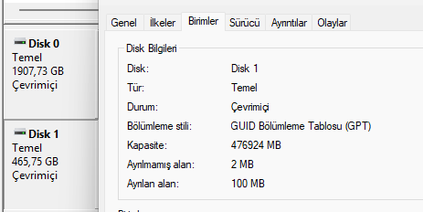 Windowsun yüklü olduğu diske Disk Yönetimi aracını kullanarak sağ tık > Özellikler -> Birimler sekmesindeki ekran görüntüsünü atar mısın. GPT mi MBR mi kullanılmış?