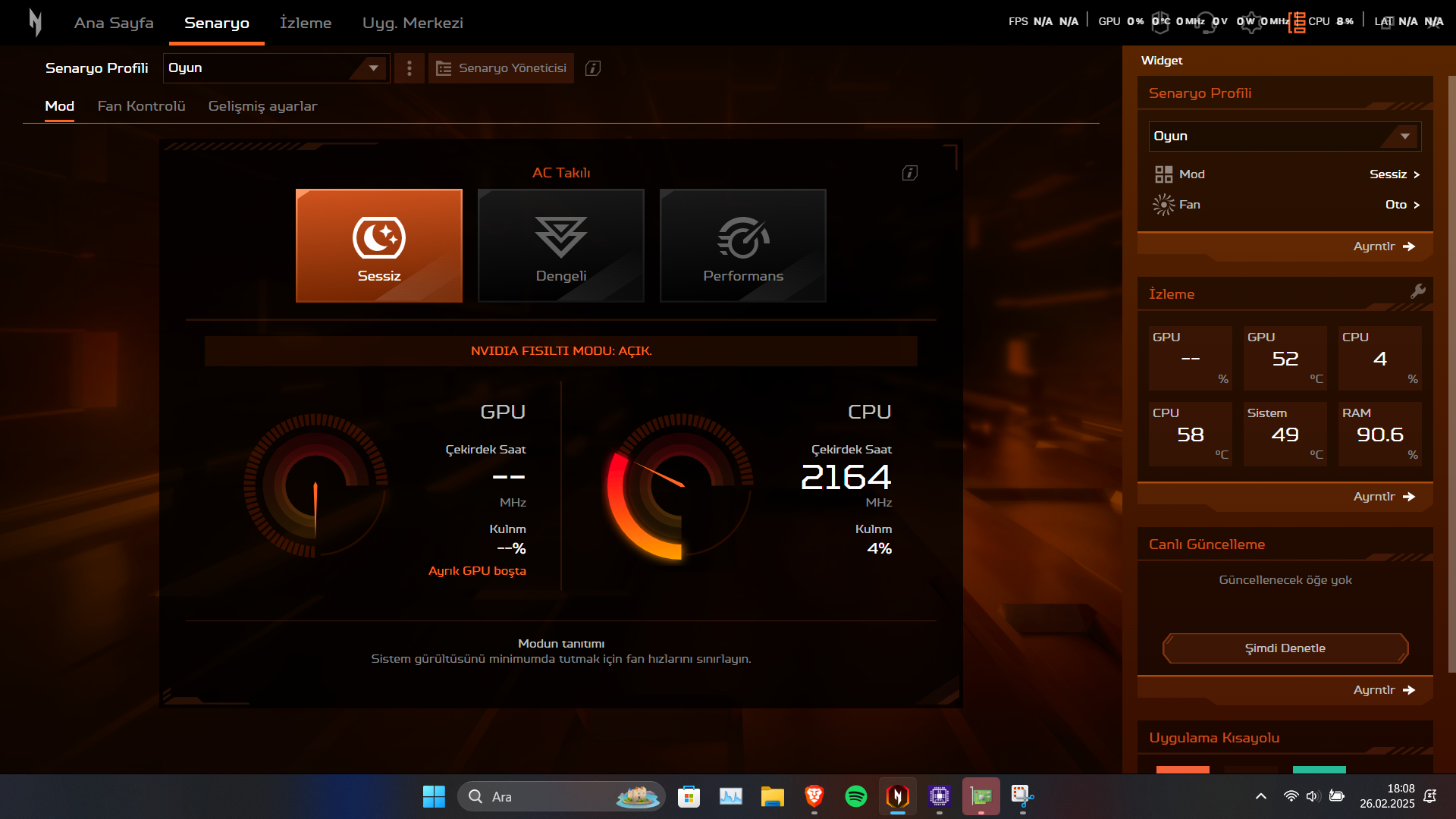 Acer'in kendi uygulaması olan NitroSense gayet güzel bir uygulama bana kalırsa. İçinde sıcaklık değerlerini ve kullanımlarını görebilirsiniz, fan hızlarını ayarlayabilirsiniz (bu konuya daha detaylı soğutma bölümünde gireceğim), hoparlör modlarını ayarlayabilirsiniz, laptop açılma ekranındaki simgeyi değiştirebilirsiniz, belli güncellemeleri kontrol edebilirsiniz ve yapışkan tuşları kapatabilirsiniz. Açıkçası bu menüde Windows açılış ekranını özelleştirme ve yapışktan tuşları kolayca kapatma bayağı hoşuma giden özellikler. NitroSense için ise klavyede özel bir tuş var, tek tuşla uygulamaya pratik bir şekilde ulaşılabiliyor.